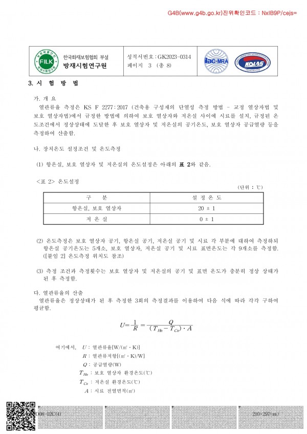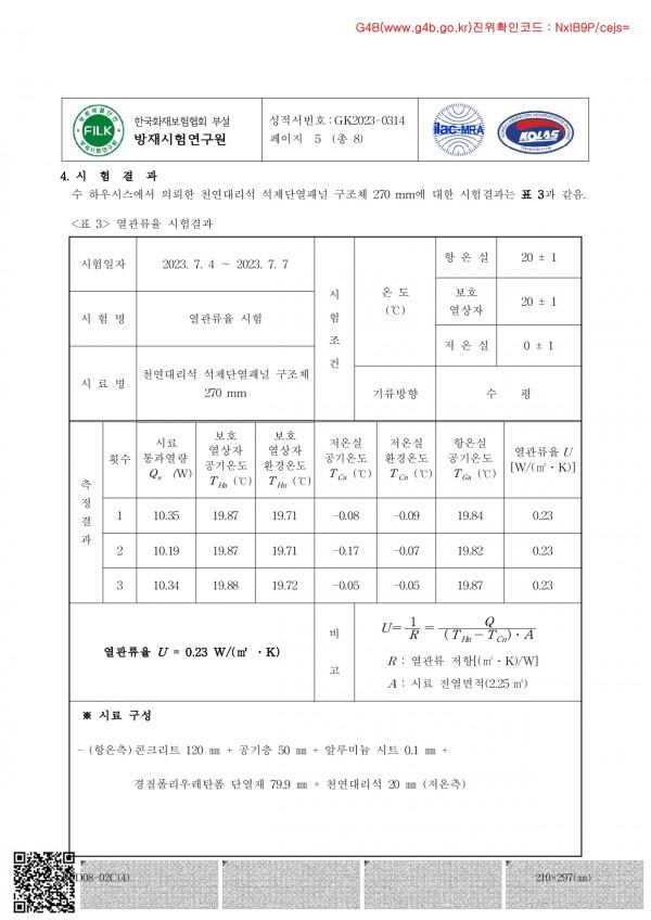 열관류율시험성적서 - 석제단열패널 구조체 > 인증내역